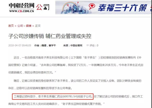事件起因是中国经营报于4月7日发布的一篇报道,题为《子公司涉嫌传销 辅仁药业管理或失控》,报道中提到:工商登记资料显示,老子养生系辅仁药业(600781.SH)控股子公司。而文中的辅仁药业(600781.SH)便是目前发布公告的辅仁药业集团实业股份有限公司。