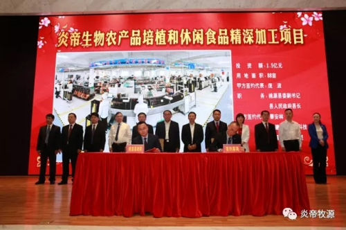 近日,桃源县政府举办“昂首迈进新时代,开放桃源等你来”的2018桃商专题恳谈会,湖南炎帝生物工程有限公司董事长黄佳林先生、常德炎帝生物科技有限公司总经理秦安林先生及副总经理杨胜辉先生受邀参会。会议现场我司总经理秦安林先生作为代表与桃源县政府签订了关于“炎帝生物农产品培植和休闲食品精深加工项目”的投资建设协议。