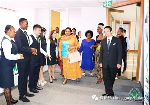 中午一点,王后一行人在安保人员的护卫下来了到约堡分公司,公司员工和经销商代表列队热烈欢迎王后的到来。随后王后一行人在非洲区域总裁张良军先生、约堡分公司总经理郭磊先生和约堡分公司财务经理司马艳娜女士的陪同下参观了公司,并在会议室内进行了一个半小时的会议。在会议中,张总代表总公司以及南非约堡公司对祖鲁王后这次的光临表示欢迎和感谢。张总随后向王后一行人介绍了绿世界集团企业文化、公司的使命和愿景以及在非洲的十年的发展历程,并介绍了绿世界植物营养因子有机肥等新产品。王后高度赞赏我公司所取得的成就,感谢公司为南非人民的健康以及经济发展、就业所做出的努力。王后对绿世界植物因子有机肥产生了浓厚的兴趣,并提出合作的意愿。
