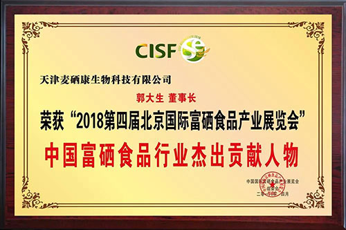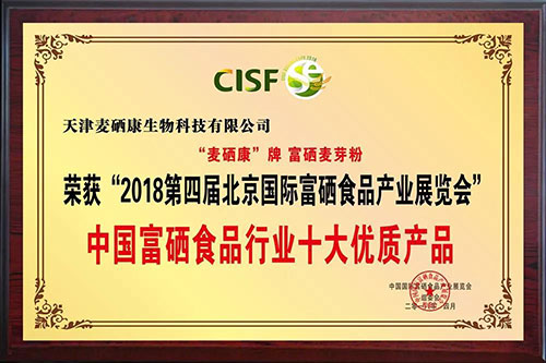 当天有近千家国内外企业上千万种产品参加展览,天津麦硒康生物科技有限公司应邀参加本次展会,郭大生董事长及其营销团队出席了颁奖仪式,同时天津市特殊食品行业协会领导也莅临参加了本次展会。会前大会组委会进行了严苛的评审,天津麦硒康生物科技有限公司在近千家企业中脱颖而出,生产技术精湛,产品品质优良,共获得“中国十佳富硒食品品牌”等三项大奖,其中麦硒康获得“中国十佳富硒食品品牌”称号,麦硒康牌富硒麦芽粉获得“中国富硒食品行业十大优质产品”称号,郭大生董事长获得“中国富硒食品行业杰出贡献人物”殊荣。