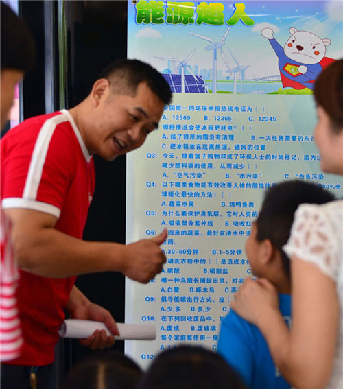 在低碳欢乐行和能源超人互动游戏中,全家同心协力挑战能源节约妙招与低碳出行方式。在爸爸妈妈的引导下小朋友,通过“节约用水”、“少开车”和“少用一次性筷子”等环保行为顺利通过环保游戏挑战。
