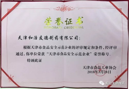 在4月17日召开的“天津市食品行业工作会议暨天津市食品工业协会会员代表大会”上,天津和治友德制药有限公司等25家企业,被天津市食品安全信用体系办公室授予“天津市食品安全示范企业”称号,并在会议上获得奖牌。