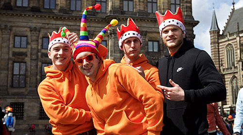 每年,为了庆祝皇家生日,荷兰都会举办全国性的盛大庆典。因为荷兰皇室姓氏为Orange,因此将橙色定为国色,这一天举国衣服穿着橙色,街道、运河、公园都会有狂欢的人们在热闹欢庆,被誉为“橙色狂欢”,以庆祝欢腾的节日气氛。