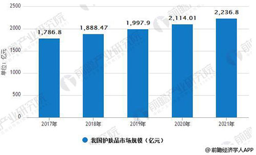 人口结构变化、收入水平提升带来的消费升级、消费习惯的改变、核心消费人群的增加、化妆品消费理念的加强、营销渠道的多元化将是决定未来中国化妆品市场容量的核心因素。作为化妆品行业的主要子行业,护肤品将在未来几年内呈现持续增长态势。至2021年其市场规模将达到2,236.8亿元,2017年至2021年年均复合增长率为5.8%。