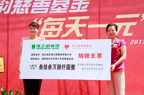 2011年5月,绿之韵慈善基金“每天一元钱”的慈善倡议活动得到了公司领导、员工、经销商和社会各界人士的积极参与。活动现场,劳嘉总裁代表集团公司向长沙市青少年发展基金会捐赠爱心善款33.8万元,用于改善山东、内蒙古希望学校办学条件。