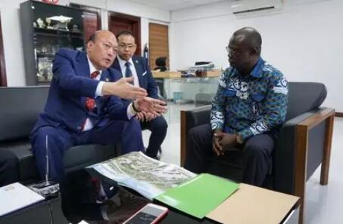 图:李金元董事长向加纳大学校长耶本泽.欧杜罗.欧素教授介绍天元大学的建设