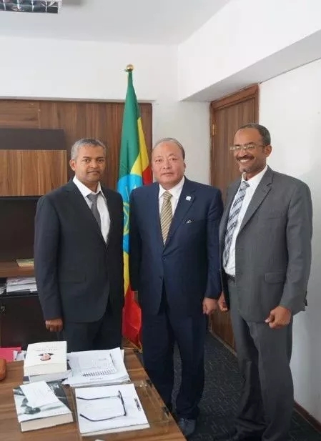 埃塞俄比亚新任投资局局长贝罗丘.莫库瑞亚博士(左)、李金元董事长(中)与副局长特卡.葛伯瑞萨斯(右,Teka Gebreyesus)合影