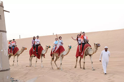 到场的来宾与沙漠精灵骆驼合照,身着阿拉伯白袍的礼仪人员为来宾献上最高级别礼遇,赠送特色项链、顶级服务的敬茶仪。