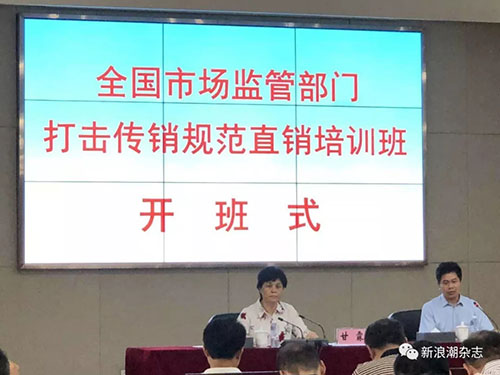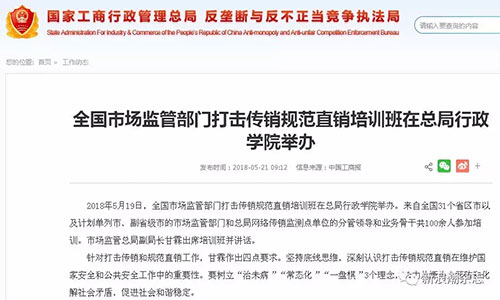 2018年5月19日,全国市场监管部门打击传销规范直销培训班在总局行政学院举办。来自全国31个省区市以及计划单列市、副省级市的市场监管部门和总局网络传销监测点单位的分管领导和业务骨干共100余人参加培训。市场监管总局副局长甘霖出席培训班并讲话。