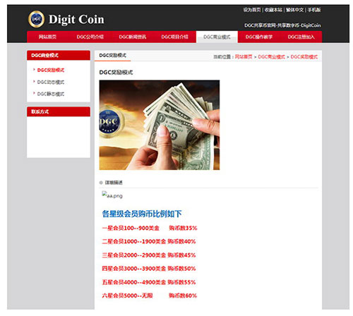 此类平台的主要特点是采用金字塔式的发展会员经营模式的假虚拟货币平台,宣称其虚拟货币或积分币可产生高额回报。此类平台多以“拉人头”“高额返利”等模式吸引投资者,涉嫌进行传销。如下图所示的这家平台,按照层级进行高额奖励,同时以“动态(投资金额越多奖励越多)”和“静态(按照固定比例进行返利)”两种收益方式吸引投资者,涉嫌传销。