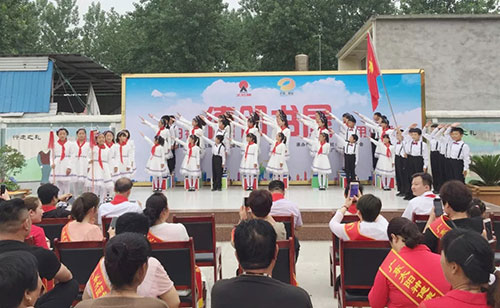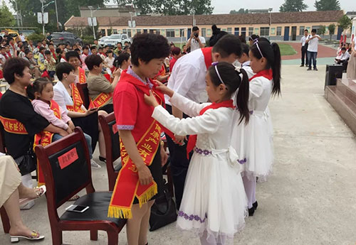 孩子们为太阳神爱心伙伴佩戴红领巾,表演节目
