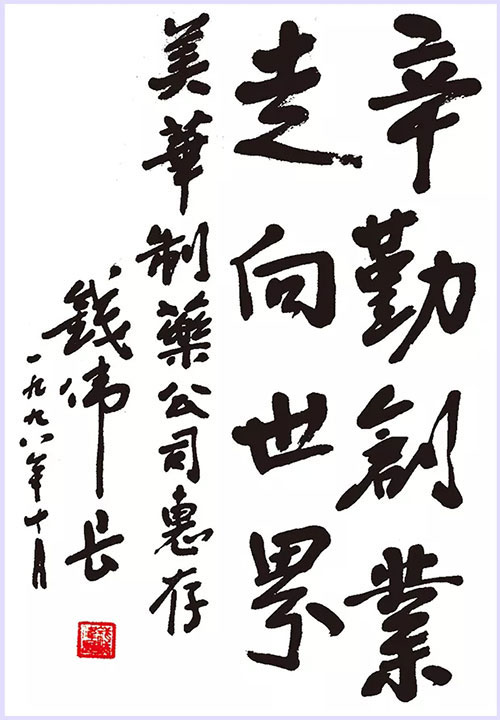九届全国政协副主席钱伟长为心源素题词:辛勤创业、走向世界。