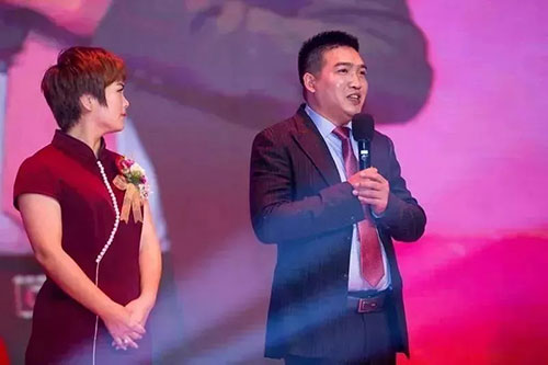 直销中华区执行总裁陶剑俊先生为钟小容女士颁发鲜花和徽章