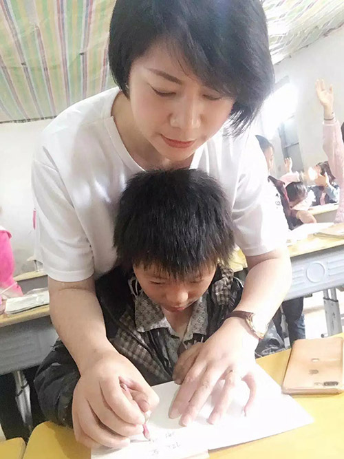 “青禾大使”蓝青和李永兵给五年级的孩子们讲他们小时候的故事,教他们唱《外婆的澎湖湾》,还非常用心地带来了满满一车的课外书、笔记本和书包,送给他们。