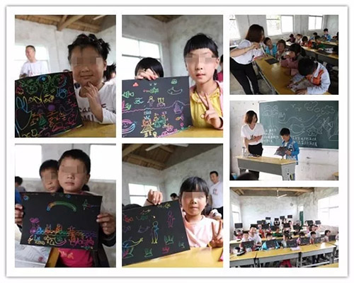 “康美爱心大使”李雪给一年级的孩子们带来音乐课和绘画课,并送去画纸和彩笔。