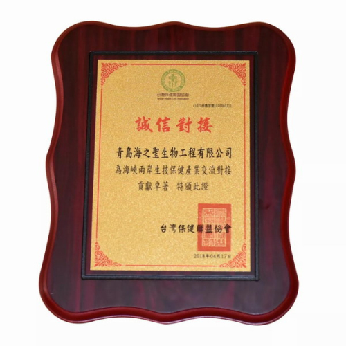 近日,诚信立企的海之圣公司,通过参与并支持海峡两岸生物科技保健产业对接交流会议,获得台湾保健联盟协会颁发的“诚信对接”荣誉。