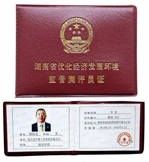 为进一步加强全省营商环境建设,拓宽优化经济发展环境监督渠道,经企业申请和单位推荐,通过相关部门审核和公开公示,湖南省优化办决定聘请湖南省总商会等18个单位(商会、协会、联合会)为2018—2020年度湖南省优化经济发展环境监督测评站;429个单位(企业)为监督测评点;434个单位(企业)负责人为优化经济发展环境监督评测员。绿之韵集团以其“诚实守信、规范经营,积极履行社会责任”的良好企业形象,经过相关部门严格审核把关,最终被评定为“2018—2020年度省优化经济发展环境监督测评点”。绿之韵集团常务副总经理胡均安被聘为“湖南省经济发展环境监督测评员”。
