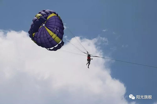 最令人觉得惊险难忘的是我们的第三天的行程,太平洋探险之旅。当被滑翔伞带着跟着游艇飞上天空的那一个瞬间,当喝下第一口咸涩的海水的那一个瞬间,当第一次戴着氧气罩潜入海里,小鱼儿在身边游来游去的那一个瞬间,所有的恐惧、迷茫都消失殆尽,剩下的只是平和安详,静静的只有享受的恬淡。其实,人生的经历大都如此:起初,对于未知,我们心存不安,害怕面对和改变。可是当一切终于来临,我们无法逃避的时候,跨了过去,也不过如此。我们曾经害怕的不过是内心那个不够强大的自己。所以,成长是突破自己最好的方式。我们这一群人,真的由衷的感激,感激遇到康婷,遇到阳光旗舰,把我们逼成最好的自己。