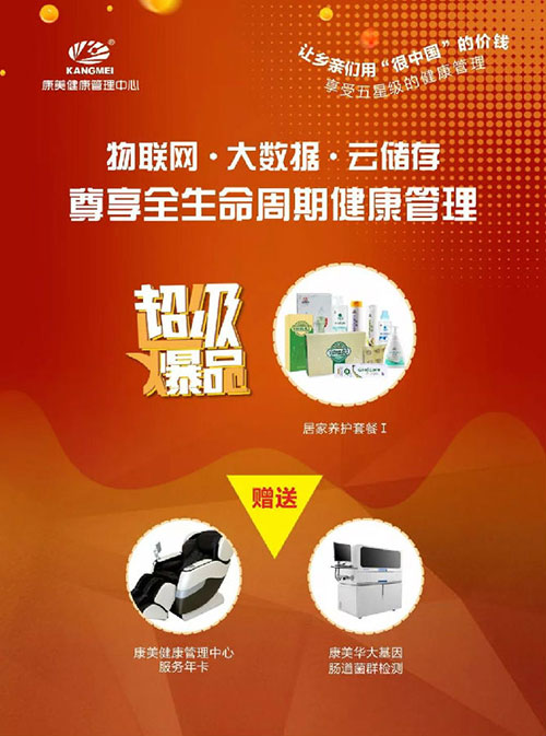 顾客进入康美健康管理中心,不仅可以享受到健康评估、智能按摩、网络问诊、灸法调理、健康食疗等一条龙的全生命周期健康管理服务,而且选购居家养护套餐 I ,我们还免费赠送康美华大的肠道菌群检测(仅限前10000份)和一次网络在线问诊。让每个人足不出户就能享受到高品质的健康管理服务。