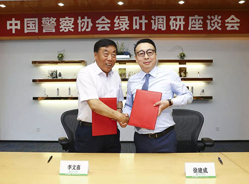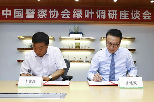 李文喜副主席和徐建成董事长分别代表中国警察协会和绿叶科技集团,共同签署绿基金向辽宁省警察协会困难民警捐赠协议书。