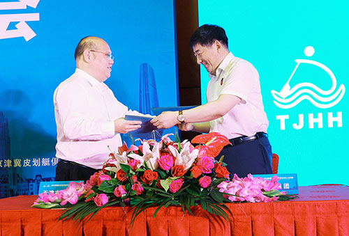 天津市冬季和水上运动中心主任张仲权与权健集团副总裁徐卫东签署赛事赞助协议