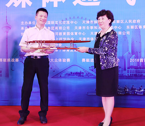 天津市体育局党委书记、局长李克敏向权健集团董事长束昱辉赠送“权健号”赛艇模型