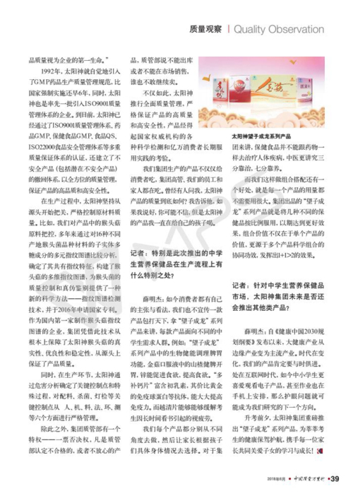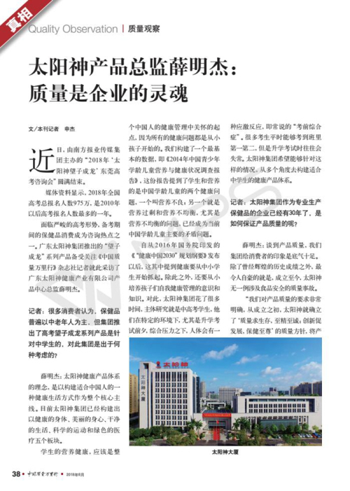 为什么太阳神“望子成龙”系列产品一经推出,就受到广大学生家长的认可呢?《中国质量万里行》通过采访太阳神健康产业产品总监薛明杰,于六月刊发布《质量是企业的灵魂》专题报道,揭晓了其中的答案。
