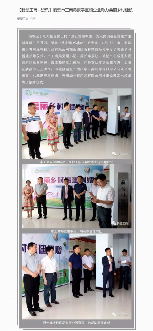 鹤壁市工商局发文赞扬绿叶援建美丽乡村善举