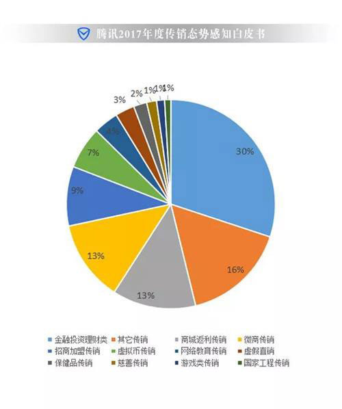 腾讯安全反诈骗实验室为腾讯旗下的七大实验室之一,以反电信网络诈骗专家智库、腾讯安全云库、鹰眼智能反电话诈骗盒子为反欺诈辅助。2017年,腾讯还发布了2017年度传销态势感知白皮书,虚拟币传销占比7%。