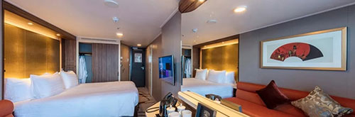 亚洲全新豪华邮轮——世界梦号上共有1686间客房,包括海景房、露台房、内舱房等,为了让康美最精英能饱览瑰丽海景,感受面朝大海,春暖花开的美妙,康美精心安排,让千名康美精英均入住到有私人露台的豪华海景房。