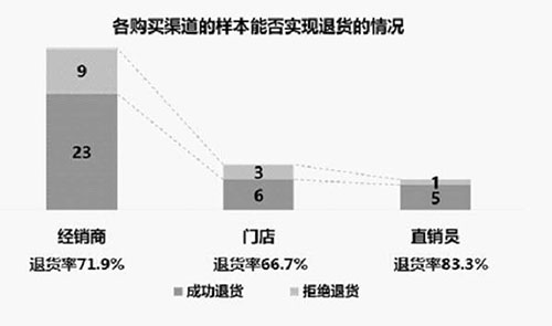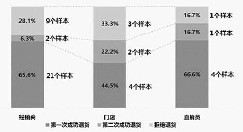 从退货顺利程度看各个购买渠道,第一次成功退货率为经销商65.6%、门店44.5%、直销员66.6%。后经400热线电话协商,第二次申请退货成功率为经销商6.3%、门店22.2%、直销员16.7%。总体上,门店退货相对不太顺利,拒绝退货比例最高,为33.3%。(见图十一)