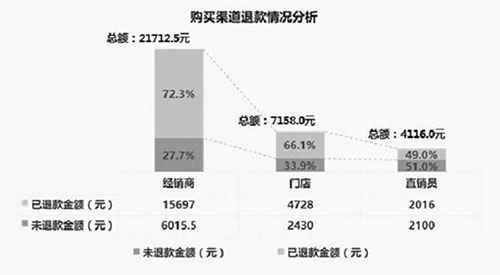从退款时长看,各购买渠道退款到账时长差异不大,分别为经销商2.09天、门店2.83天、直销员3天。平均退款到账时长为2.35天。