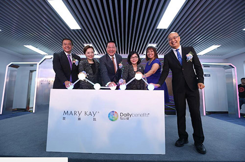 玫琳凯全球首席供应链官Thomas、玫琳凯全球首席市场官Sheryl、玫琳凯亚太区总裁蔡庆国、玫琳凯大中国区总裁麦予甫等在开幕典礼上点亮象征玫琳凯科技中心神奇能量的分子式。