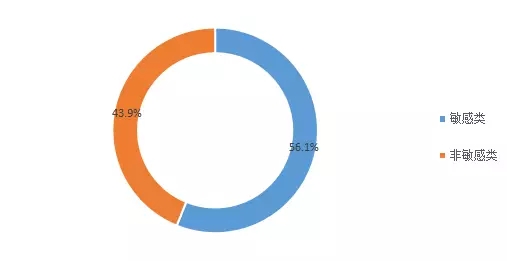 将舆情信息分为敏感类和非敏感类信息进行统计,其中敏感类信息有49689条,占总数的56.1%,非敏感类信息有38805条,占总数的43.9%。