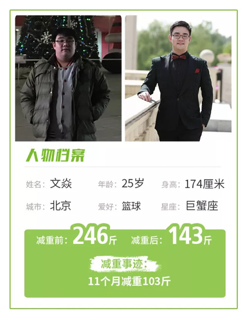 文焱的体重与日俱增,尤其是升入大学后,平时爱宅在宿舍玩游戏的他体重一路蹿升,达到了200斤!脂肪的侵略还远未结束,大学毕业后,文焱进入建筑单位工作,频繁的酒局更加助长肥胖。