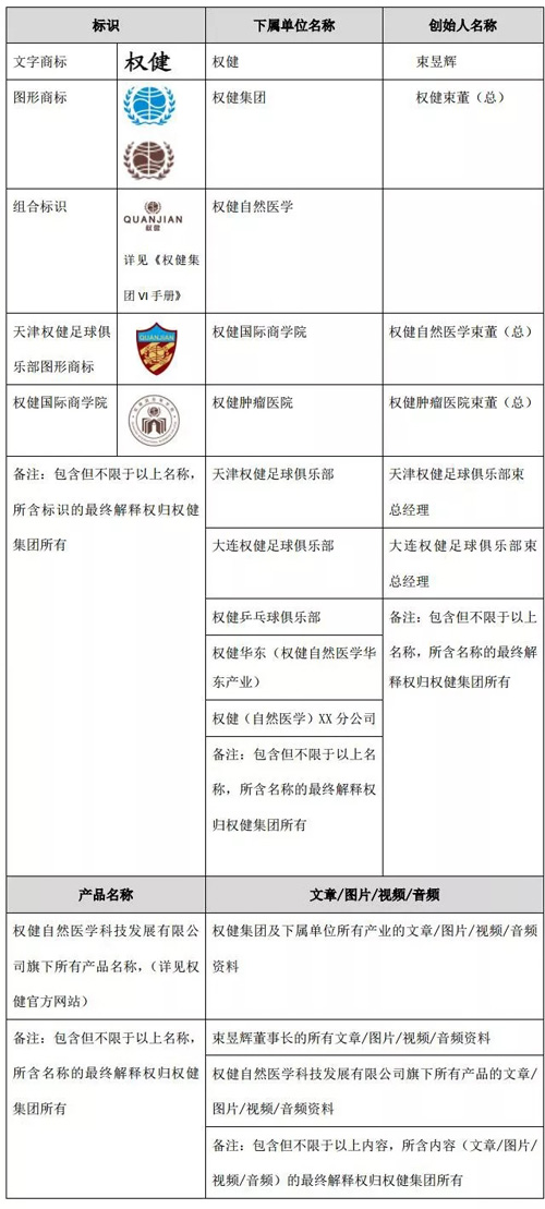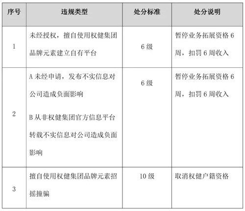 依据权健集团下属单位权健自然医学科技发展有限公司《经销商守则》,对违反《关于经销商使用权健集团品牌元素的管理规定》的经销商,自规定正式发布后的15个工作日内,没有做出更正、删除、申请审核的经销商,以及明知故犯的经销商做如下处分: