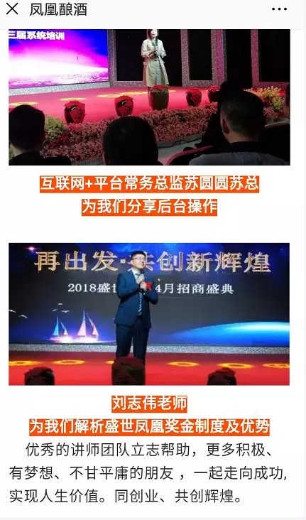 据悉,凤凰酿酒为“互联网+万店联盟+消费者联盟”的模式,奖金制度为双轨制,经销商称,1980元就可以成为会员,选任意酒,第一层市场返利1000元,第二层市场返利600元,量碰200元,以此类推二层以下600+200元拿无限代,日封顶2000元/天(层奖+量碰)。