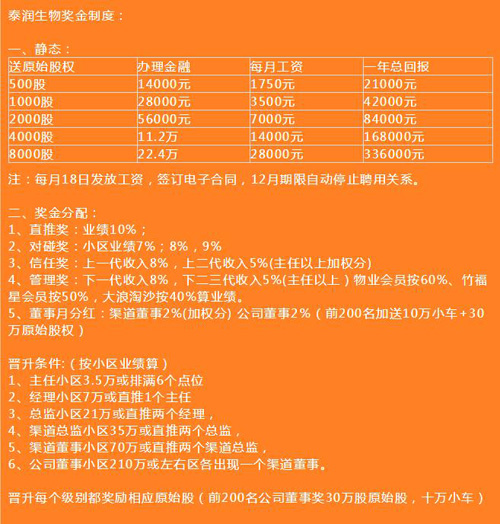 泰润生物就是一个资金盘返利制度,风险极大,很快就会被政府打击,奉劝大家不要参与投资、运作。