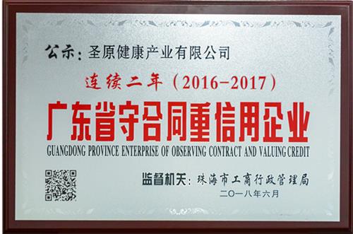 近日,广东省工商行政管理局对2017年度广东省“守合同重信用”企业进行公示,圣原健康产业有限公司(下文称“圣原”)顺利通过广东省工商行政管理局的最终评审,连续两年获评“广东省守合同重信用企业”荣誉称号,并获颁荣誉牌匾和荣誉证书。