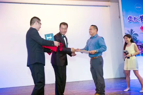 安然公司直销中华区执行总裁陶剑俊先生与塞班岛观光局市场总监Broc Calvo先生代表双方互换友谊的礼物。