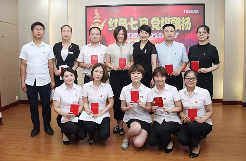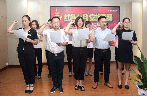 绿之韵集团党委书记刘云为新发展的预备党员佩戴党徽并发放《十九大党章学习手册》
