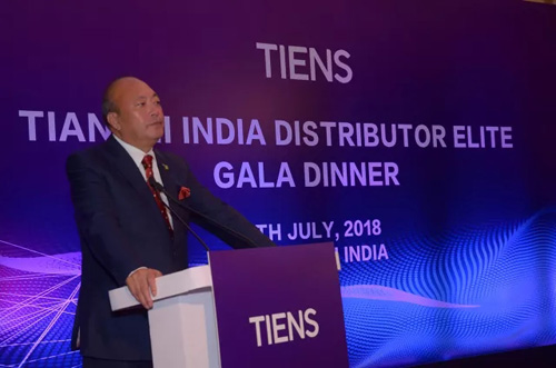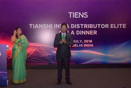 在司仪活力四射的开场后,董事长上台致词,董事长说,时隔八年又来到印度见到大家非常高兴,今天下午的大会开得非常成功,勉励经销商精英们在天狮第三次创业“一体多翼”战略的指导下,创造更好的业绩。他祝愿大家身体健康、万事如意、恭喜发展、恭喜发财!