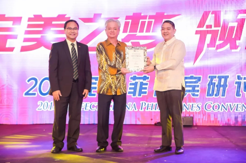 Arturo P. Boncato, Jr.代表菲政府向完美公司颁发感谢状