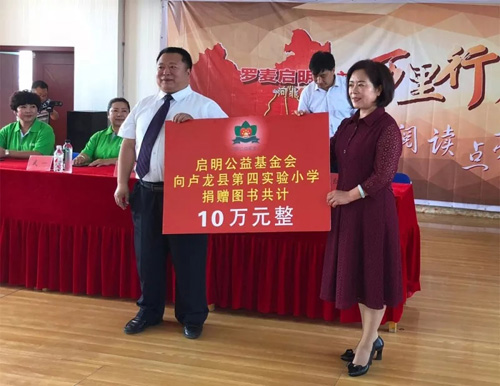 “启明公益万里行——阅读点亮人生”捐书助学活动是启明公益基金会为贯彻落实十九大会议精神,支援贫困地区教育文化事业发展的长期性公益活动。5月25日,“启明公益万里行——秦皇岛卢龙站”图书捐赠暨“中国航天启明图书室”落成仪式在卢龙县第四实验小学拉开帷幕,启明公益基金会为该小学带来了价值10万元的图书,增加了学校的图书数量,丰富了学生们的课余文化生活。