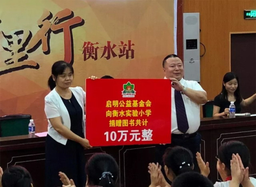 启明公益基金会响应十九大报告提出的“扶贫同扶志、扶智相结合”的方针政策,旨在帮助解决中小学校课外书籍贫乏、购书经费短缺的实际问题,做好中小学生的阅读工作。6月12日,“启明公益万里行——阅读点亮人生”捐书助学活动走进河北省衡水市实验小学,启明公益基金会捐赠了价值10万元的图书,“中国航天启明图书室”在衡水市实验小学揭牌落成。