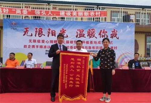 6月22日,思利及人公益基金会、无限极(中国)有限公司内蒙古分公司携手呼伦贝尔市市场监督管理局,乌鲁布铁镇党委、政府在内蒙古呼伦贝尔市鄂春自治旗乌鲁布铁镇二十里村,举行“无限阳光,温暖你我”公益捐赠暨无限极阳光种植基地成立仪式。
