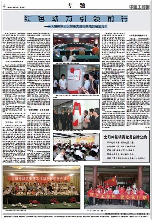 秉持正确的政治立场,2010年6月17日,太阳神成立了网络党支部,成为直销行业党建工作的落地先行者,并于2013年6月,成功升级为太阳神网络党总支。