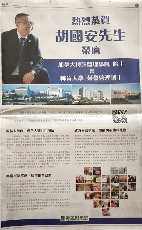 绿之韵胡国安董事长获林肯大学荣誉管理博士