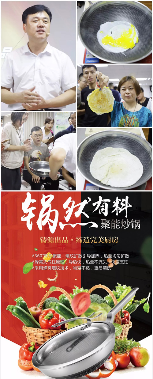 铸源国际教育部讲师王寿旻先生带来聚能炒锅产品演示。铸源聚能炒锅热量扩散快且均匀,采用蜂窝螺纹技术,物理不沾,更易清洗。王老师现场进行无油煎蛋及煎饼的实验,其惊人效果收获全场掌声。