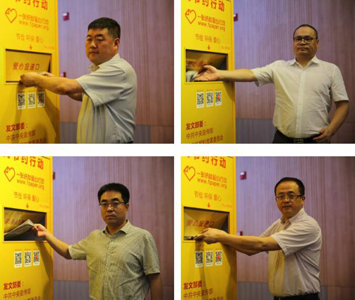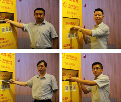 杨庆明宣布“一张纸献爱心行动”现场投放活动正式开始,在副理事长安凯的带领下,现场嘉宾排队把怀抱的一沓沓废旧报纸塞入爱心屋内,为急需救助的困难群体献上了一份爱心与真情。